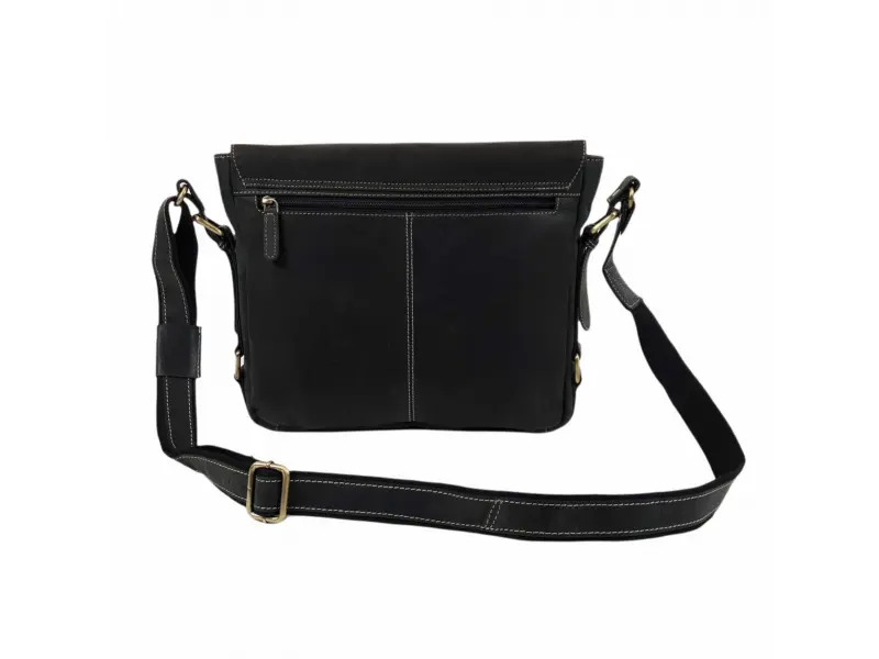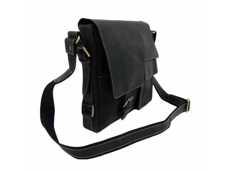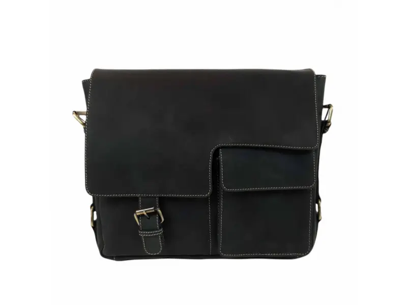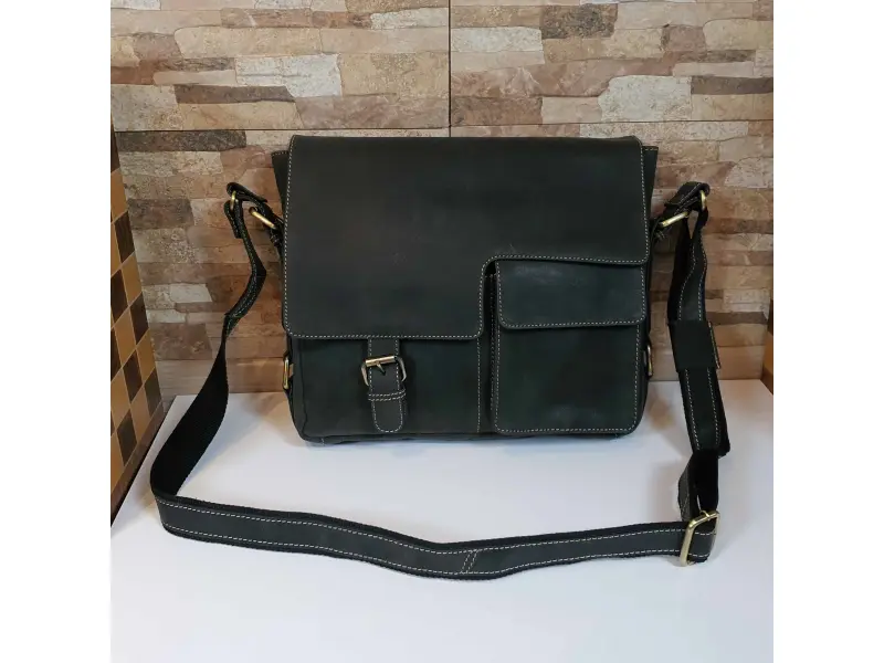 Качествена мъжка чанта от телешка естествена кожа, тип hunter. Голяма чанта с капак с магнитно закопчаване, едно основно отделение с цип, вътрешна голяма предна преграда с цип, две предни джобчета, вътрешно малко джобче с цип и отделение за ключове,телефон и химикали. Малък вътрешен портфейл от кожа и плат, заден джоб с цип и регулираща се дълга дръжка.