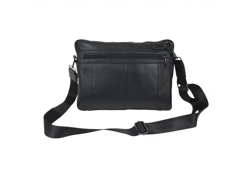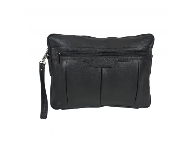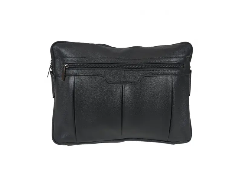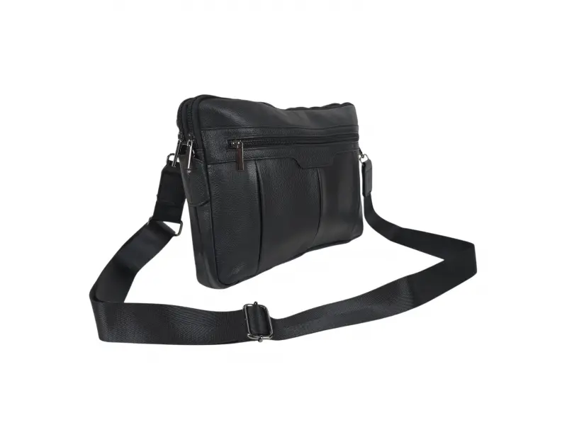 Средна мъжка чанта от качествена естествена кожа. Луксозна мъжка чанта с отделение за малък лаптоп с здрави ципове. Черна мъжка чанта с много отделения и удобна дълга регулираща се дръжка.