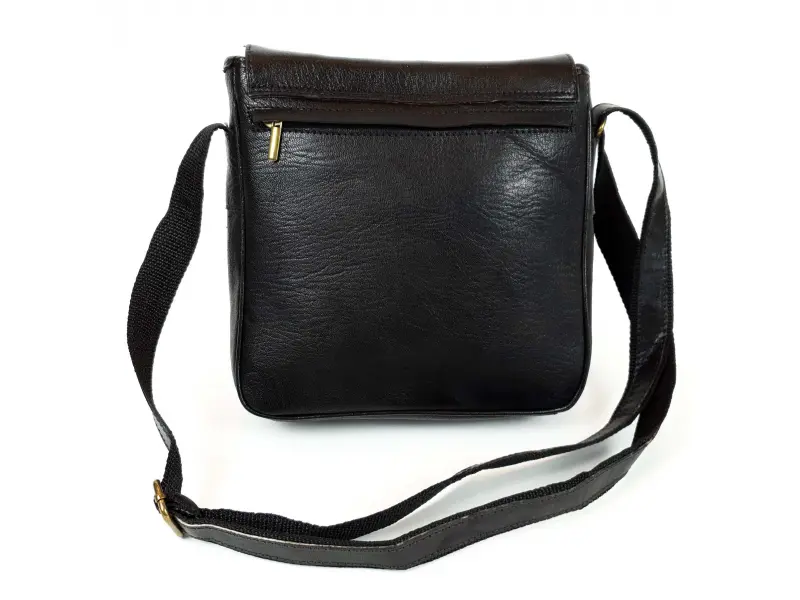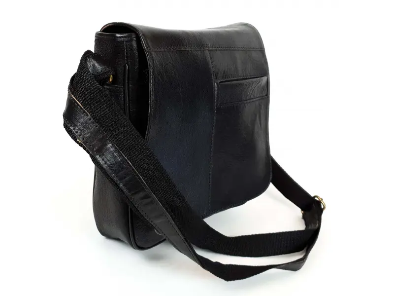 Качествена мъжка чанта от естествена кожа с капак в черен цвят произведена в Мароко. Страхотна мъжка чанта с едно голямо отделение, вътрешен джоб, заден джоб с цип, регулираща се дълга дръжка от кожа и плат.