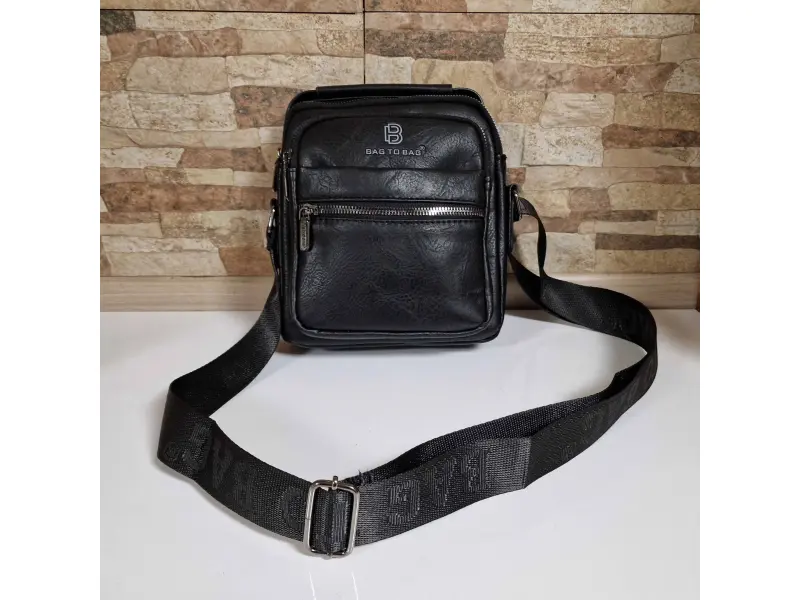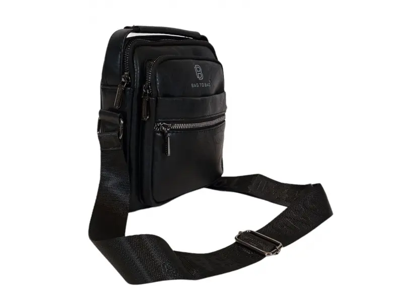 Мъжка чанта от качествена еко кожа в черен цвят. Удобна чанта с едно основно отделение с цип, малко вътрешно джобче с цип, заден джоб с цип, два предни джоба с цип и един с магнитно закопчаване. Здрава мъжка чанта с удобна дръжка за носене в ръка и регулираща се презрамка.