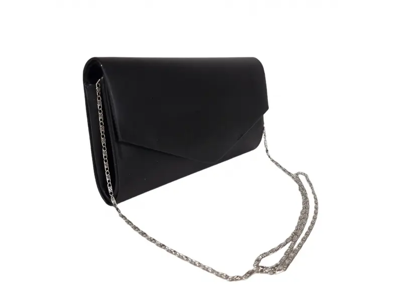 Абитуриентска чанта в черен цвят - Официална дамска чанта с едно отделение. - Отваряне и затваряне с копче тип магнит. - Дълга дръжка тип верижка в сребърен цвят.