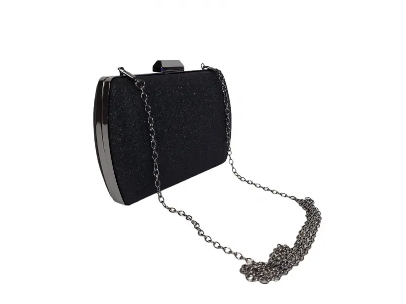 Елегантна дамска чанта в черен цвят - Официална дамска чанта с едно отделение. - Отваряне и затваряне с механизъм. - Метален кант. - Дълга дръжка тип верижка.