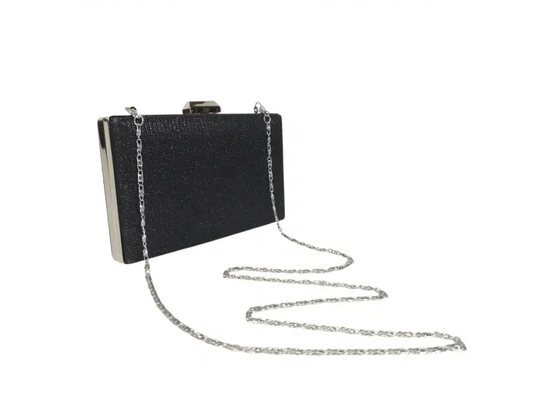 Черна елегантна дамска чанта - Официална дамска чанта с едно отделение. - Отваряне и затваряне с механизъм. - Метален кант. - Дълга дръжка тип верижка.