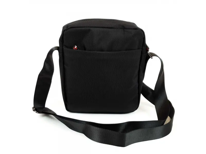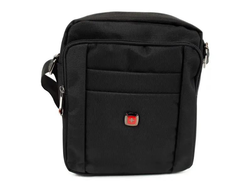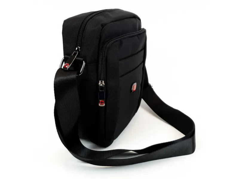 Много здрава мъжка чанта от качествена материя и удобни отделения. Мъжка чанта за през рамо в черен цвят с кръст по средата и регулираща се дръжка.