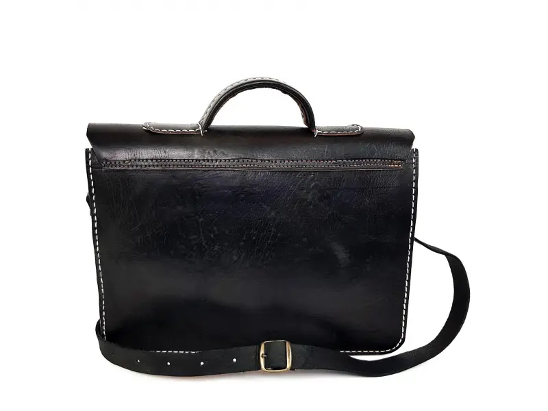 Черна мъжка бизнес чанта от естествена кожа с дълга кожена дръжка , която се регулира. Черна чанта с бял шев и стабилна дръжка за носене , заден и преден джоб с цип ,едно голямо отделение без цип , тип затваряне на капака с кожени колани.