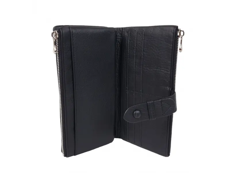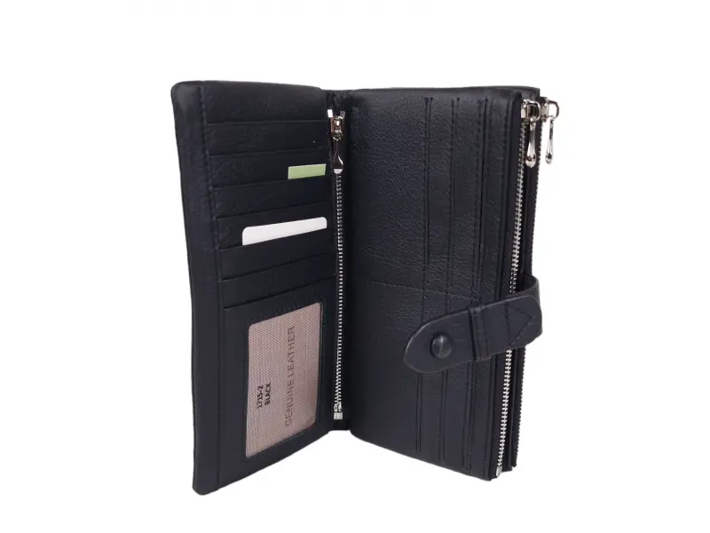 Кожено дамско портмоне - Дамско портмоне от естествена кожа. - Закопчаване с копче тик-так. - Отделения за карти. - Отделения за банкноти. - Вътрешен джоб с цип. - Монетник с цип.