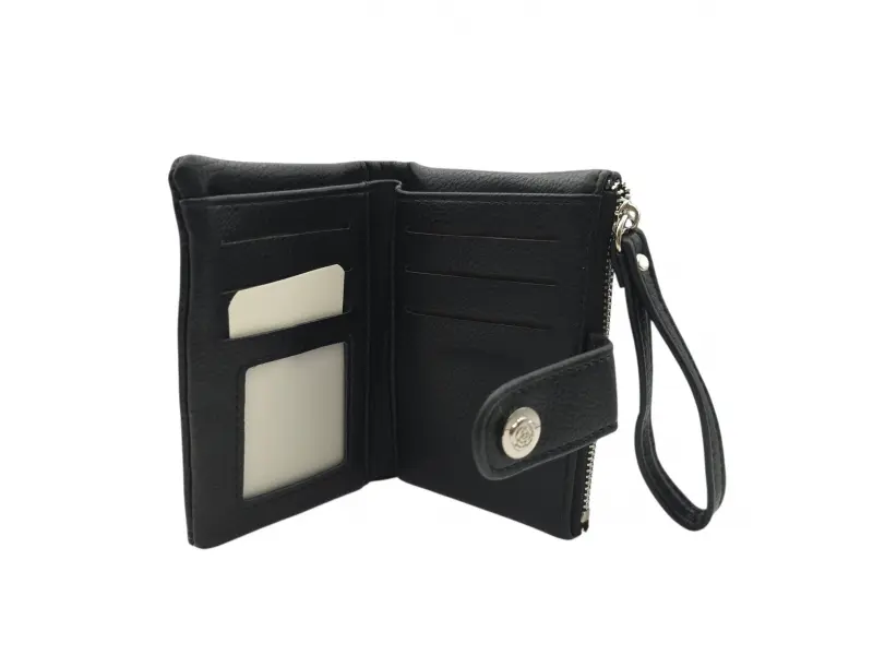Малко дамско портмоне - Дамско портмоне от еко кожа. - Закопчаване с копче тик-так. - Отделения за карти. - Отделение за банкноти. - Джоб за монети с цип.