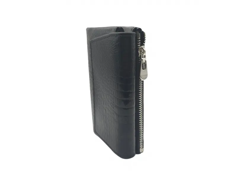 Черно дамско портмоне от естествена кожа и лак. Средно дамско портмоне с отделения за банкноти, слотове за карти и лични документи и монетник с цип. Стилно дамско портмоне с интересен дизайн.