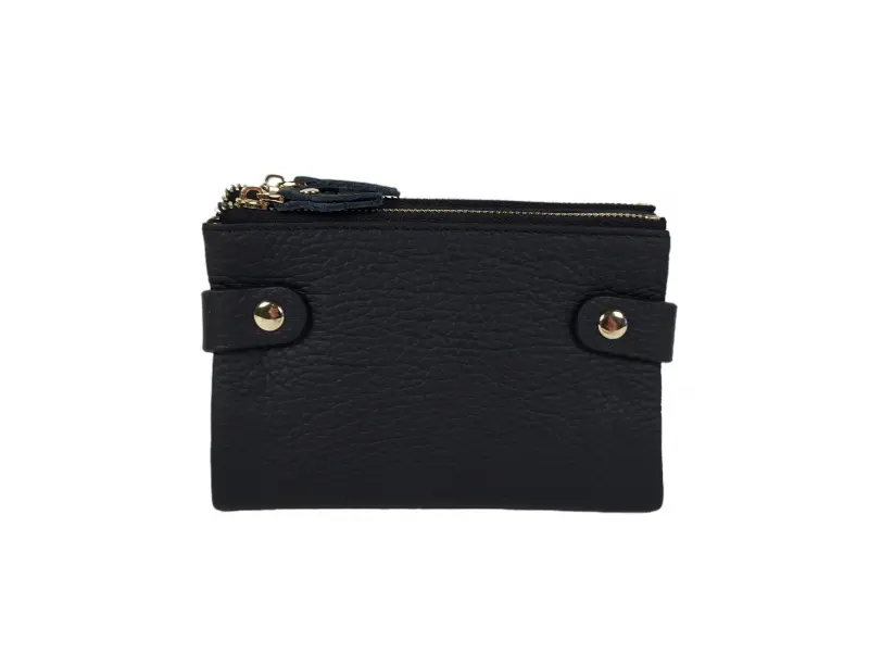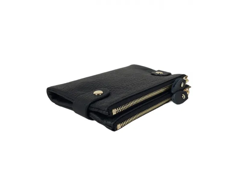 Компактно дамско портмоне - Дамско портмоне от естествена кожа. - Закопчаване с копчета тик-так. - Отделения за карти. - Отделение за банкноти. - Два джоба с цип.