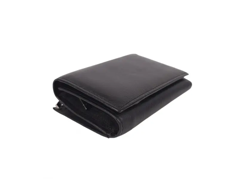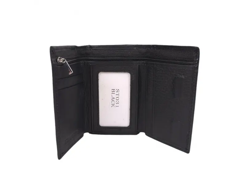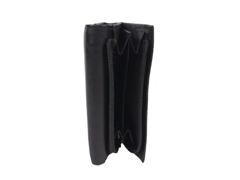 Удобно дамско портмоне от качествена естествена кожа. Черно портмоне с отделения за банкноти, много слотове за карти и лични домументи и монетник с цип. Модерно дамско портмоне с магнитно закопчаване.
