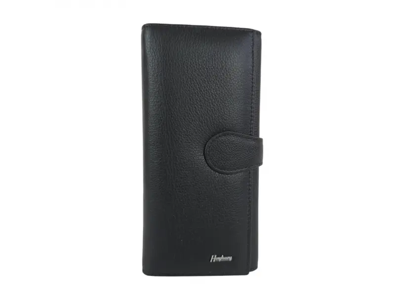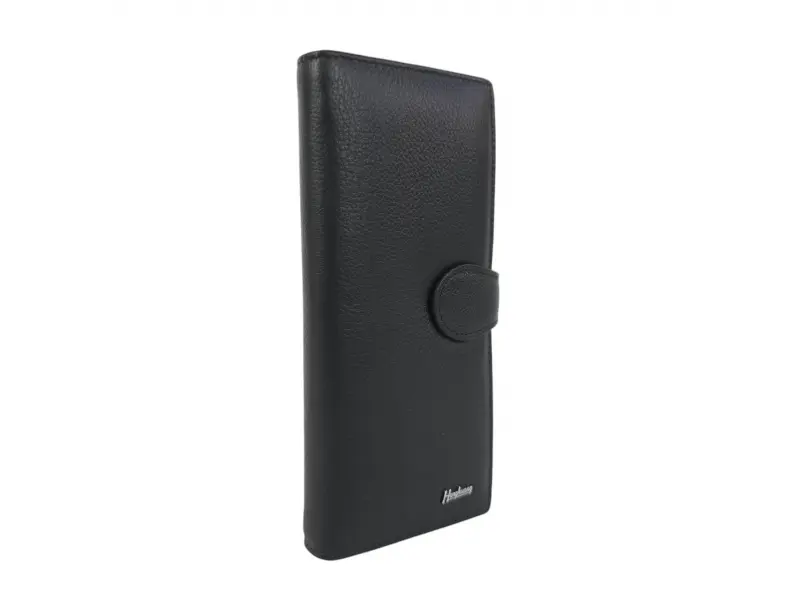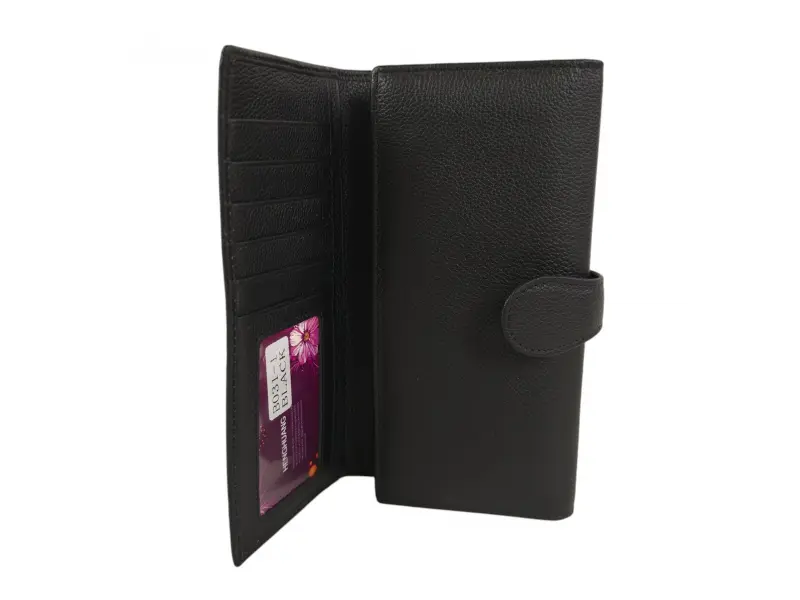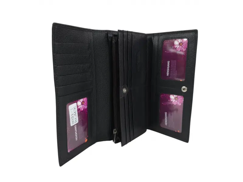 Черно дамско портмоне от естествена кожа. Вертикално дамско портмоне с отделения за банкноти, слотове за карти и лични документи и монетник с щипка цип. Красиво дамско портмоне с интересен дизайн.