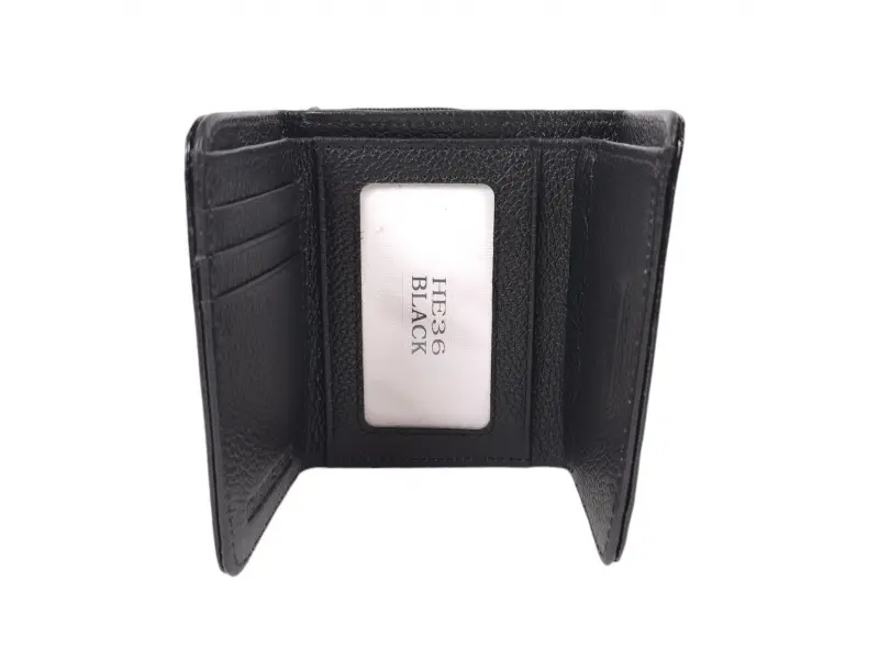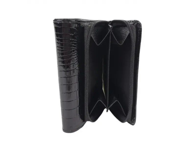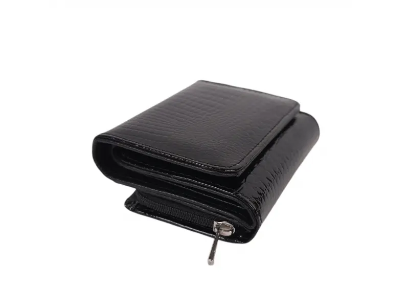 Черно дамско портмоне от естествена кожа и лак. Малко дамско портмоне с отделения за банкноти, слотове за карти и лични документи и монетник с цип. Стилно дамско портмоне с интересен дизайн.
