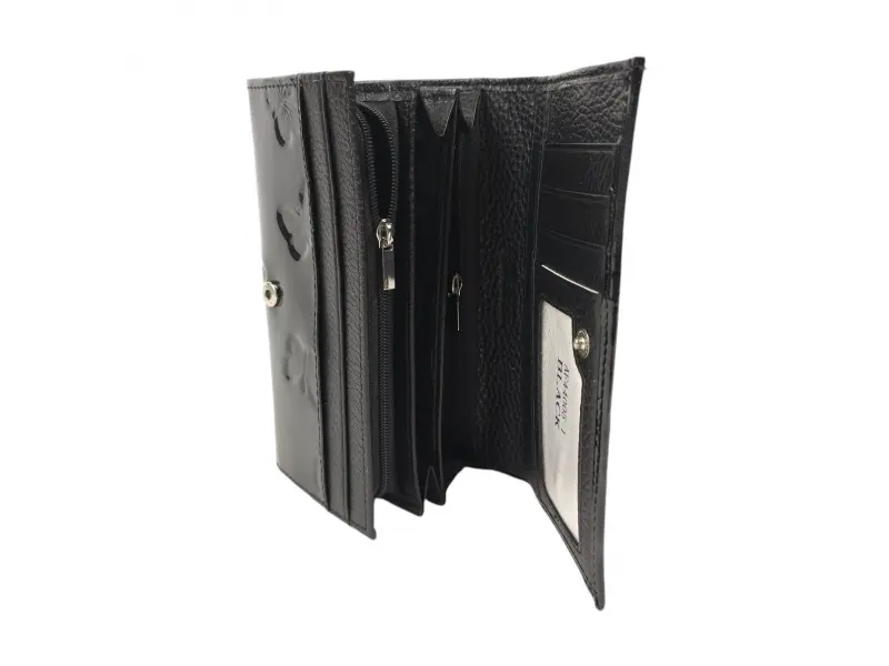 Кожено дамско портмоне с гравирани пеперуди - Дамско портмоне от естествена кожа и лак. - Отделения за банкноти. - Отделения за карти и лични документи. - Отделение за монети с цип. Разположението на пеперудите може да бъде различно.