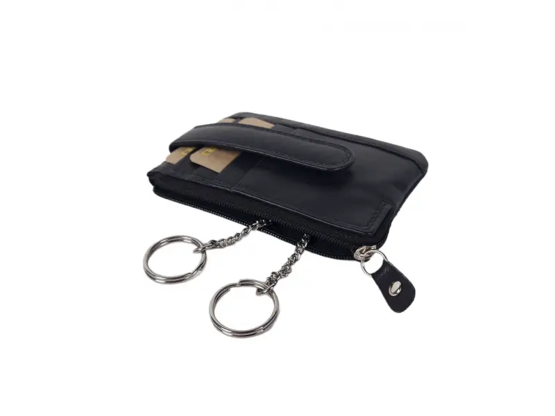 Качествено портмоне - ключодържател в черен цвят - Портмоне - ключодържател от естествена кожа. - Отделение за банкноти. - Отделение за монети. - Отделение за карти и лични документи. - Два ринга за закачане на ключове.