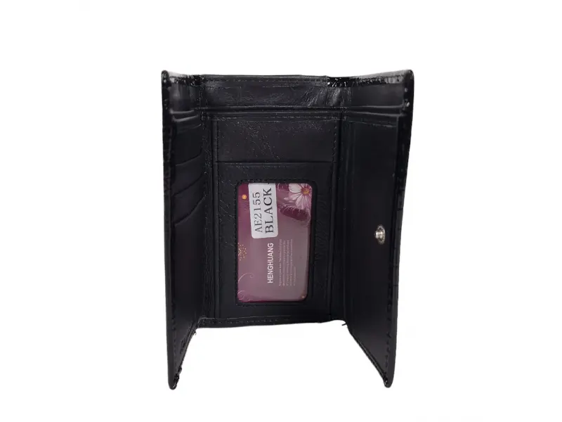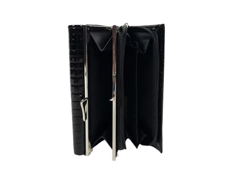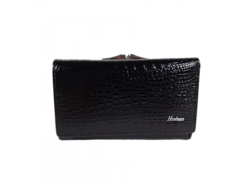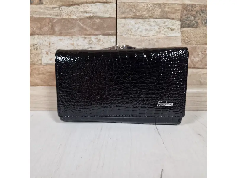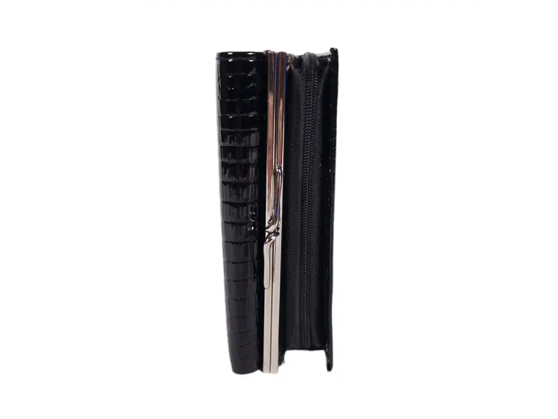 Среден размер дамско портмоне от съчетание на лак и естествена кожа в черен цвят. Нов модел портмоне с отделения за монети с цип и с щипка , място за лични документи , слотове за карти , удобно разпределение за банкноти.