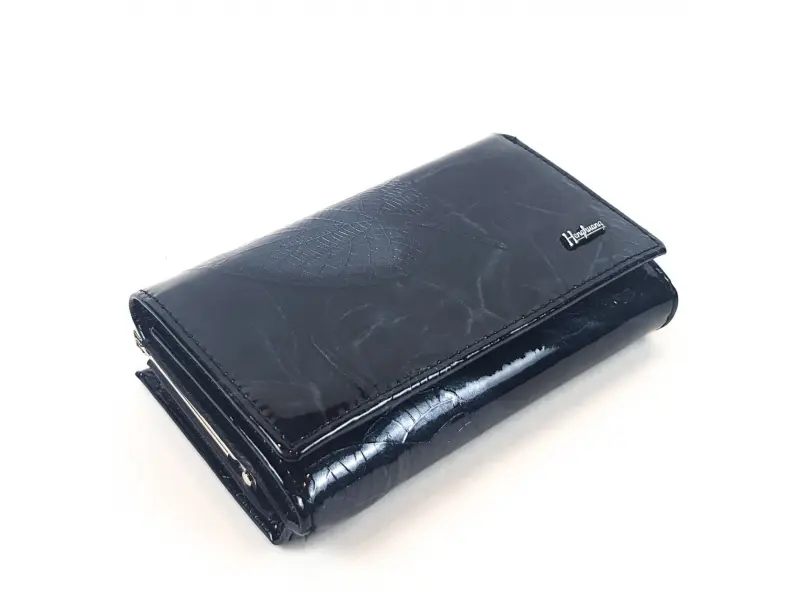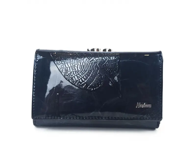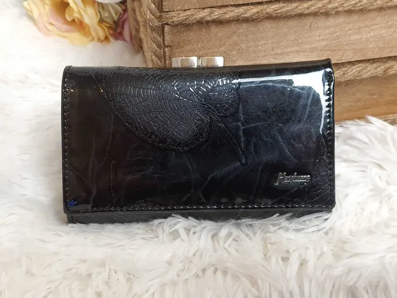 Средно дамско портмоне от естествена кожа и лак , страхотен модел с външно отделение за монети - отделение с щипка и отделение с цип , вътрешни прегради и слотове за банкноти , карти и документи. Черно дамско портмоне в среден размер с листа. Разположението на листото може да бъде различно.