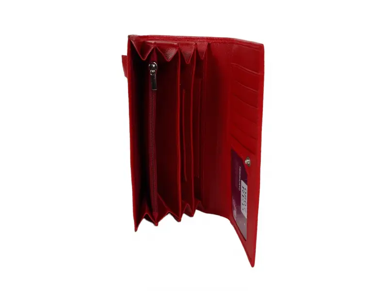 Кожено дамско портмоне - Червено портмоне от естествена кожа. - Закопчаване с копче тик-так. - Отделения за карти и лични документи. - Отделение за банкноти. - Монетник с цип.