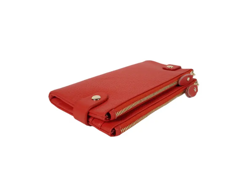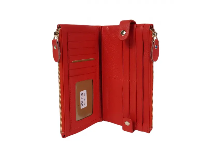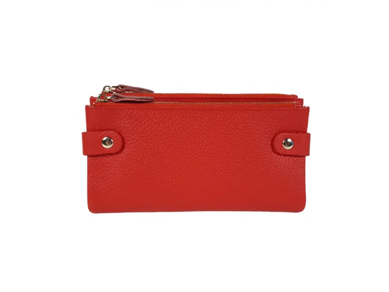 Интересно дамско портмоне - Дамско портмоне от естествена кожа. - Закопчаване с копчета тик-так. - Отделения за карти. - Отделения за банкноти. - Два джоба с цип.