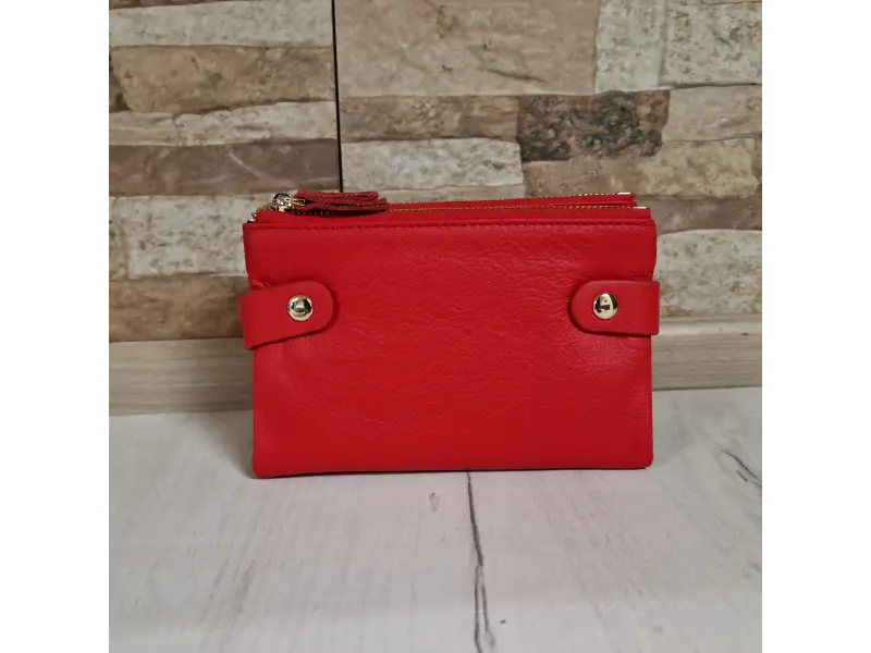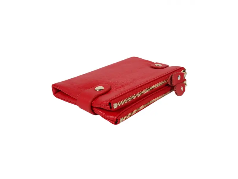Среден модел дамско портмоне - Дамско портмоне от естествена кожа. - Закопчаване с копчета тик-так. - Отделения за карти. - Отделение за банкноти. - Два джоба с цип.
