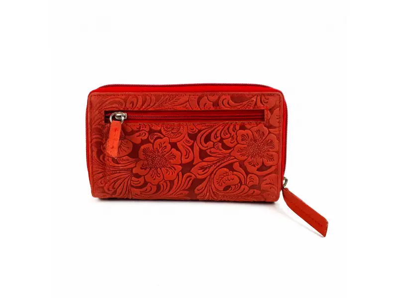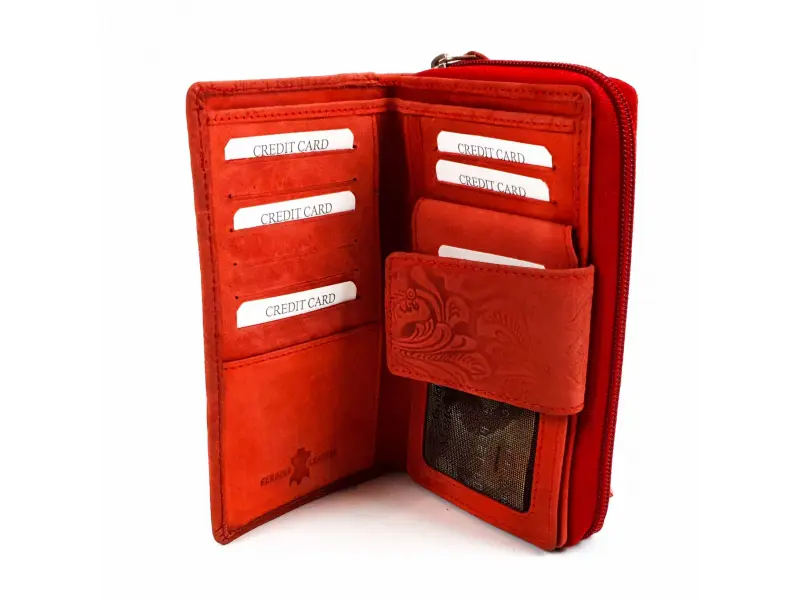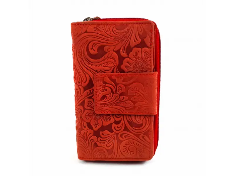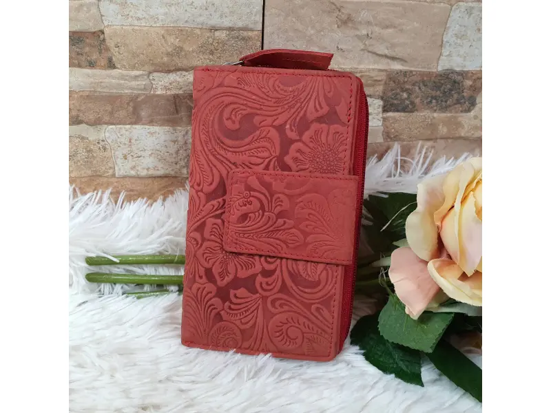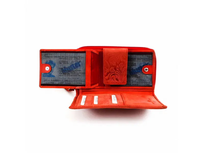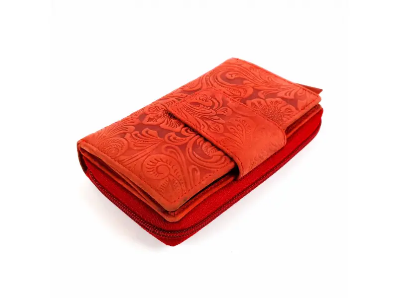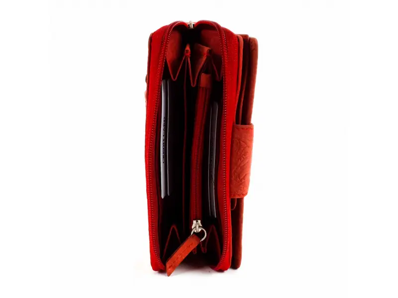 Качествено дамско портмоне от естествена кожа, която е ръчно щампована. Червено портмоне със закопчалка и много слотове за карти и документи, заден монетник с цип, отделение с цип и със слотове за карти и малък монетник с цип.