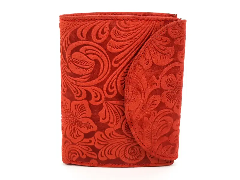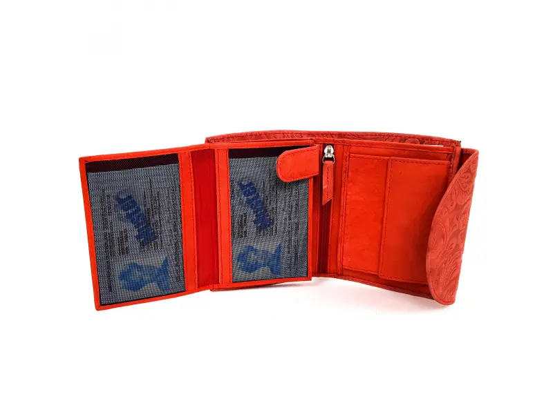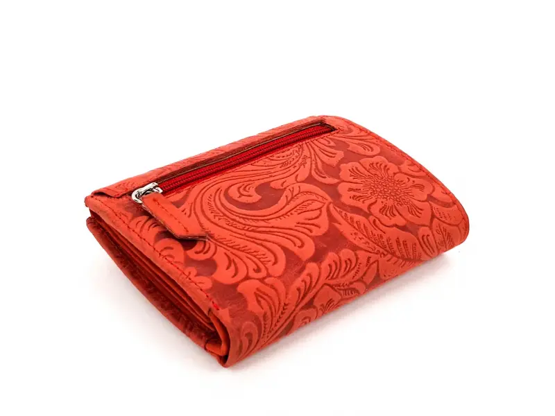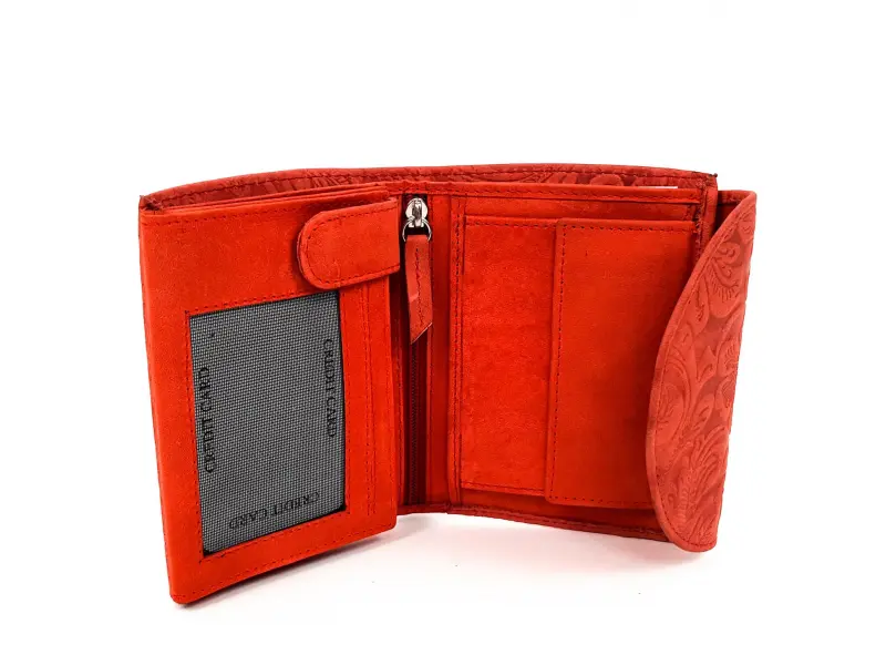Дамско червено портмоне от естествена кожа , ръчна изработка. Червено малко портмоне със закопчалка и удобно вътрешно разпределение за карти , документи и банкноти , заден джоб с цип за монети.