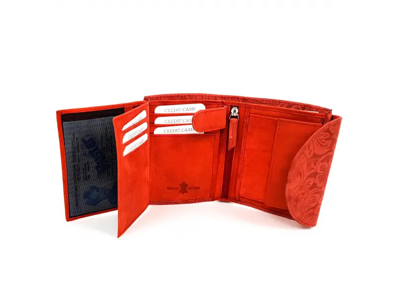 Червено дамско портмоне - ръчна изработка. Ново кожено червено портмоне с удобно разпределение за карти , визитки и пари. Дамско червено портмоне със закопчалка.