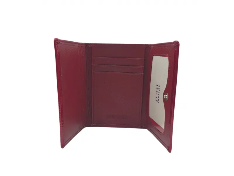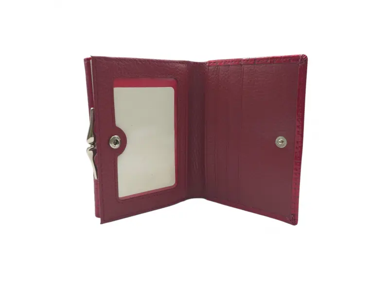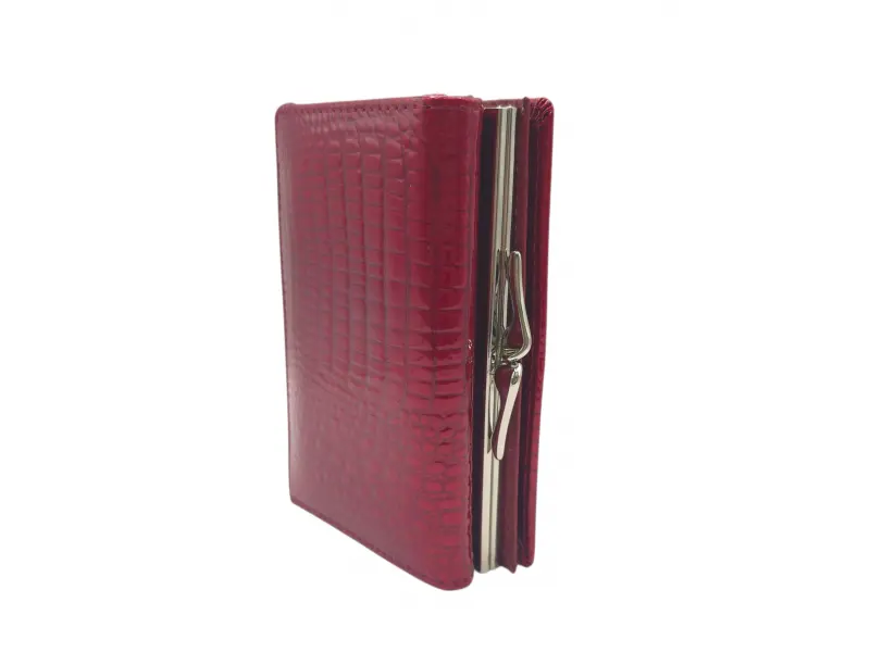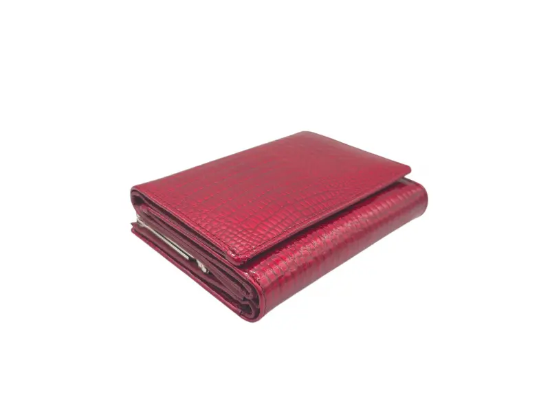 Червено дамско портмоне от естествена кожа и лак. Средно дамско портмоне с отделения за банкноти, слотове за карти и лични документи и монетник с цип. Стилно дамско портмоне с интересен дизайн.