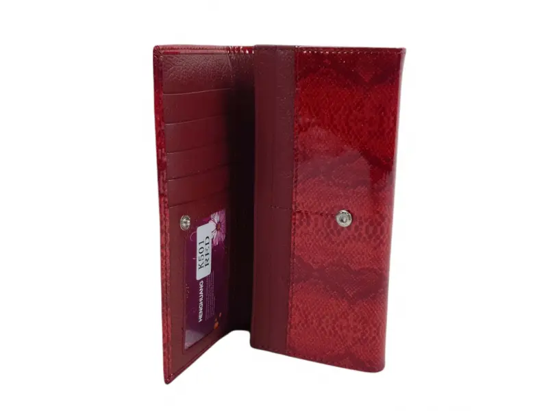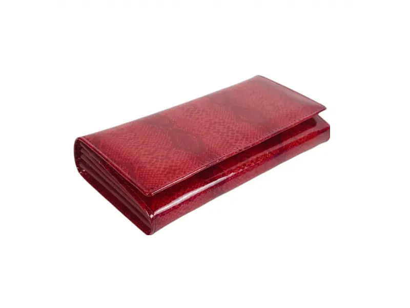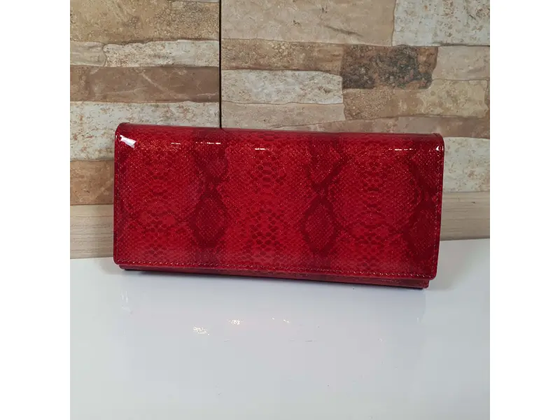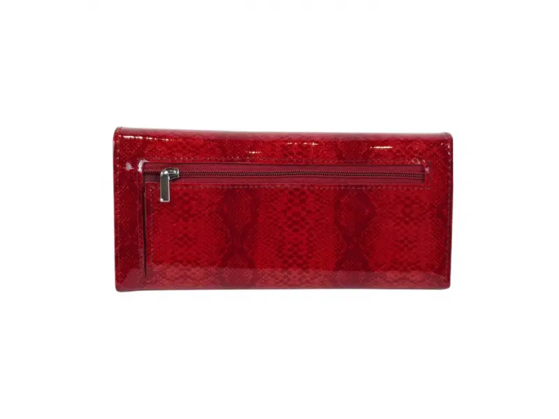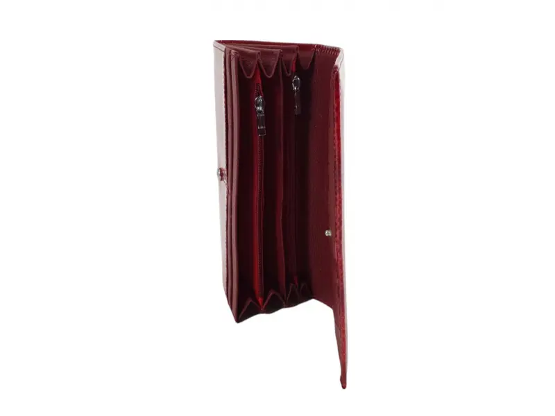 Качествено дамско портмоне от естествена кожа с лаково покритие. Червено портмоне с удобно разпределение за банкноти, много слотове за карти и лични документи, вътрешен монетник с цип и заден джоб с цип.
