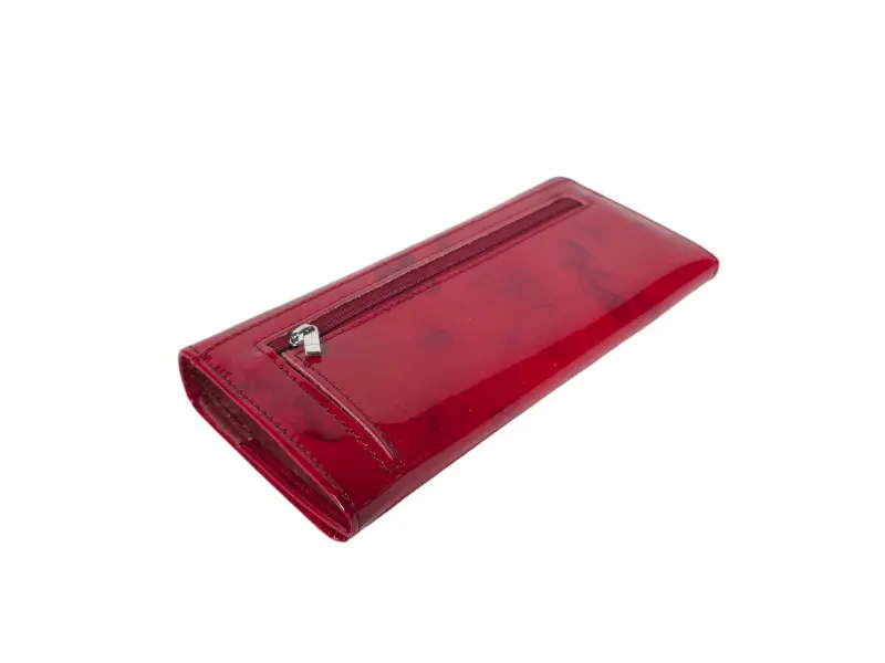 Червено дамско портмоне от естествена кожа и лак. Голямо дамско портмоне с отделения за банкноти, слотове за карти и лични документи и монетник с цип. Стилно дамско портмоне с интересен дизайн.