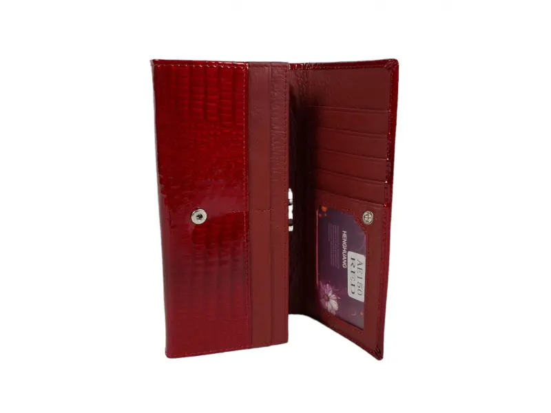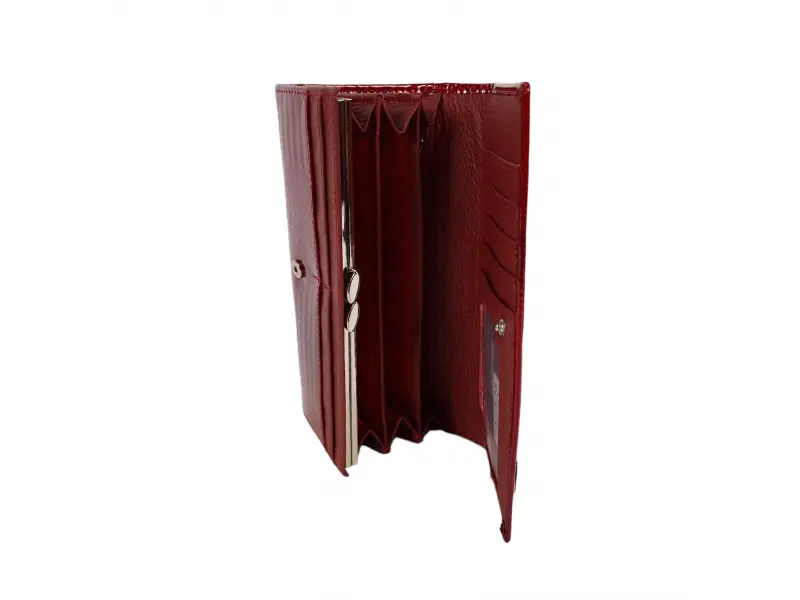Качествено дамско портмоне - Дамско портмоне от естествена кожа и лачено покритие - Отделения за банкноти. - Отделение за монети затварящо се с щипка. - Отделения за документи - Отделение с цип. - Закопчаване с копче тик-так.