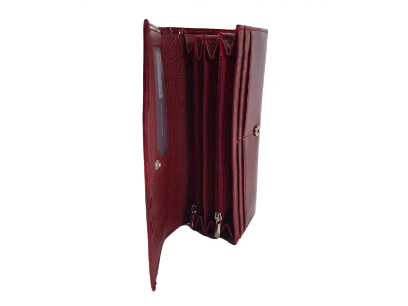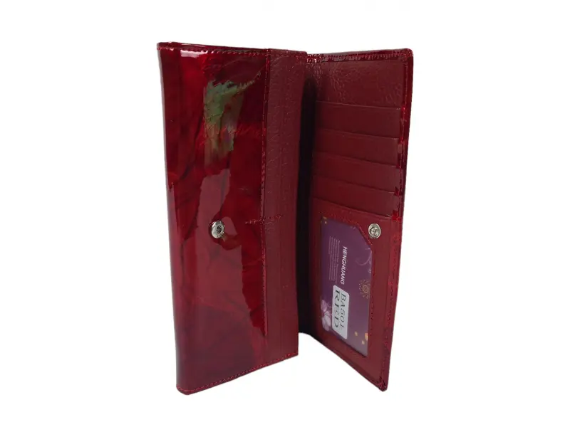 Качествено дамско портмоне - Дамско портмоне от естествена кожа и лачено покритие - Отделения за банкноти. - Отделение за монети с цип. - Отделения за документи - Задно джобче с цип. - Закопчаване с копче тик-так. - Разположението на листата може да бъде различно.