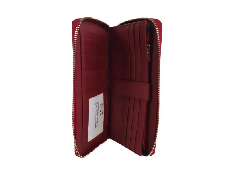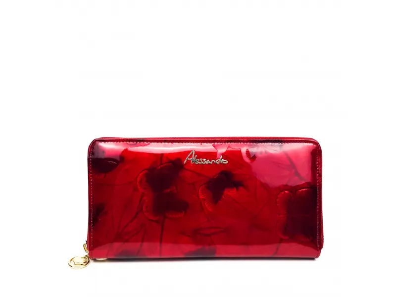 Дамско портмоне от естествена кожа в червен лак. Елегантно портмоне затварящо се с цип , удобно разпределение от естествена кожа за банкнотите , слотове за карти и място за лични документи . Отделение с цип отзад. Разположението на пеперудите може да бъде различно.