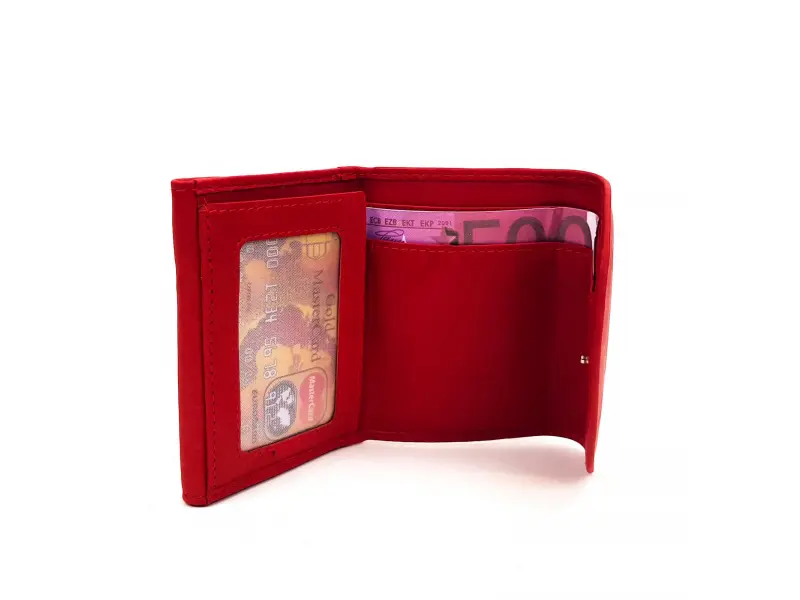 Качествено дамско портмоне от естествена кожа. Мека на допир кожа , цвят червен с отделения за карти и документи , място за пари , много компактен модел.