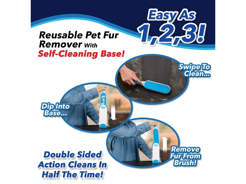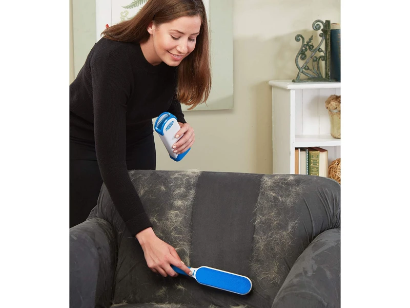 Отстранява косми и власинки. Идеален е за почистване на следи от домашни любимци (косми от кучета, котки и други). Четката е двулицева и спестява време. Почистването на самата четка става удивително просто - пъхаш в контейнера и изваждаш.