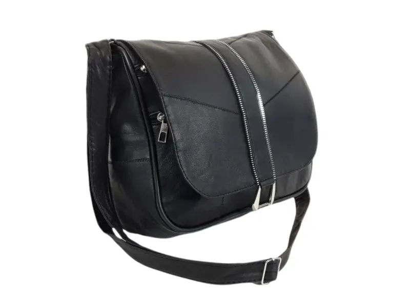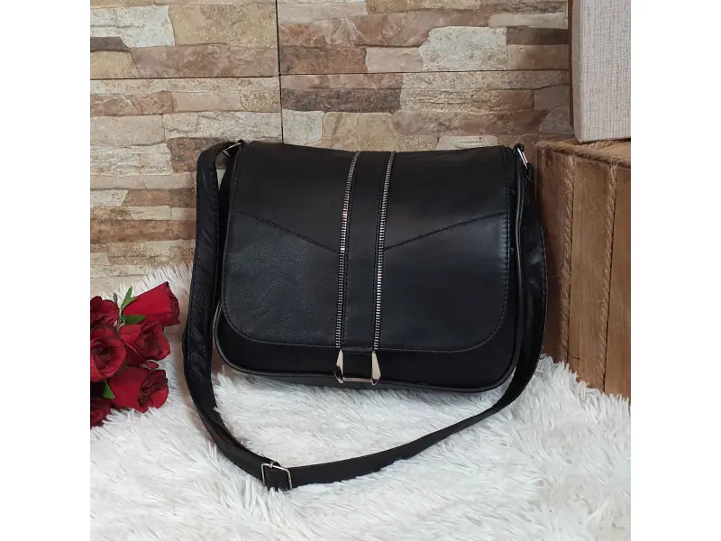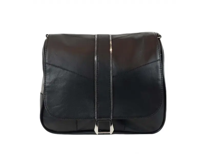 Качествена дамска чанта от агнешка естествена кожа. Черна чанта с едно основно отделение с цип и магнитно закопчаване, вътрешно джобче с цип, преден джоба под капака с цип и заден джоб с цип. Удобна чанта с дълга регулираща се дръжка.
