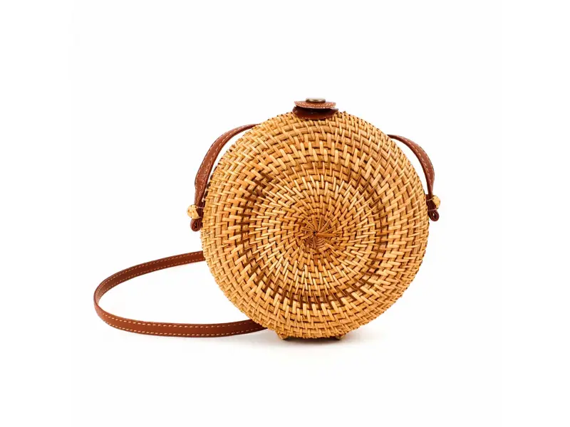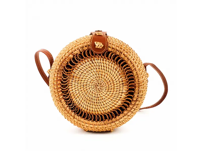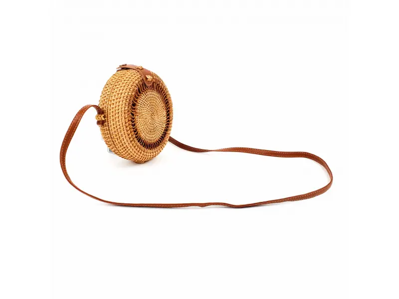 Интересен модел дамска чанта в кръгла форма. Ръчно изработена дамска чанта от ратан с едно голямо отделение, което се затваря с копче и дълга дръжка от кафява еко кожа.