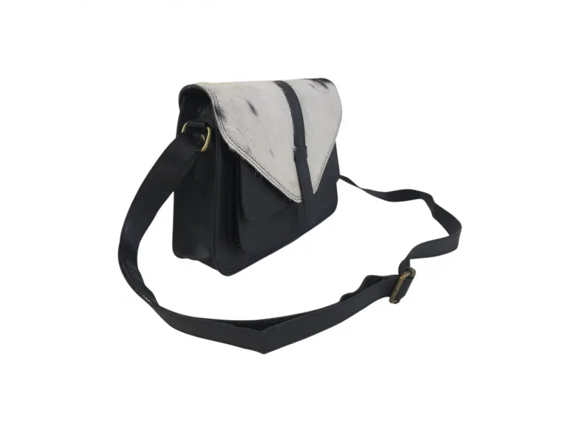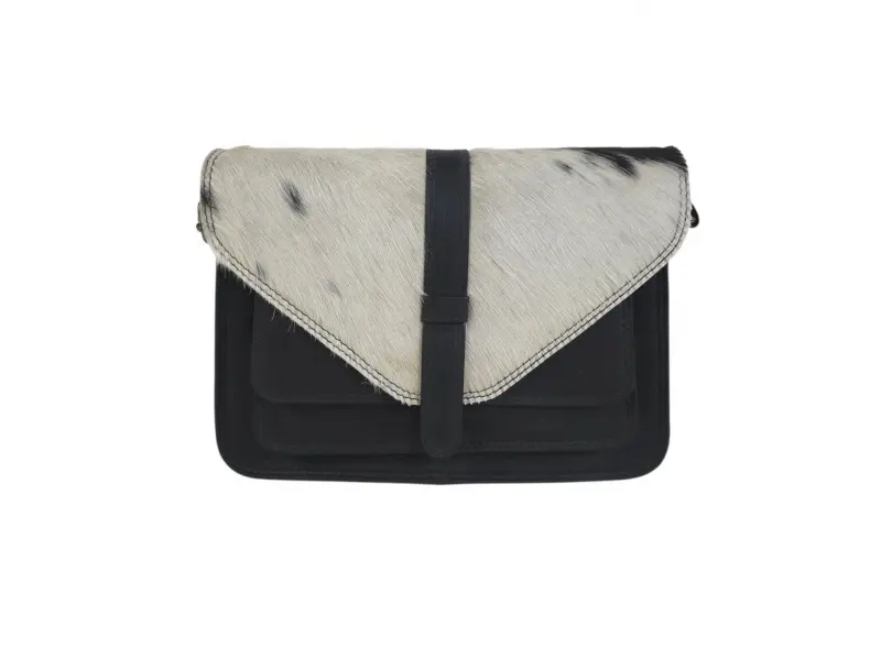 Мароканска дамска чанта - Дамска чанта от естествена кожа в съчетание с естествен косъм. - Затваряне с магнит. - Едно основно отделение без цип. - Малък вътрешен джоб с цип. - Преден джоб под капака. - Дълга регулираща се дръжка.