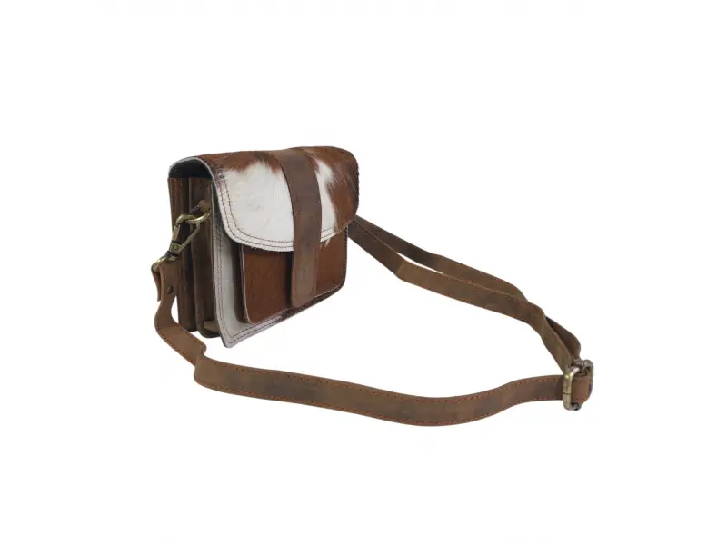 Уникален модел дамска чанта - Дамска чанта от естествена кожа в съчетание с естествен косъм. - Затваряне с магнит. - Едно основно отделение разделено на две. - Преден джоб под капака. - Дълга регулираща се дръжка.