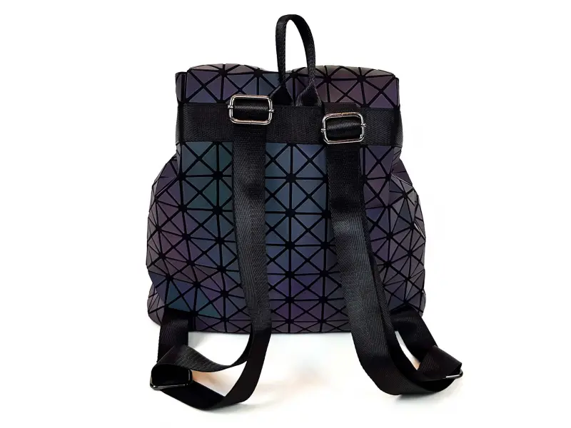 Интересна дамска раница тип мешка с едно голямо отделение , което се пристяга с връзки и затваря с капак. Дамска раница в цвят хамелеон , който си променя цвета в зависимост от светлината. Раница с регулиращи се презрамки и дръжка за закачане.