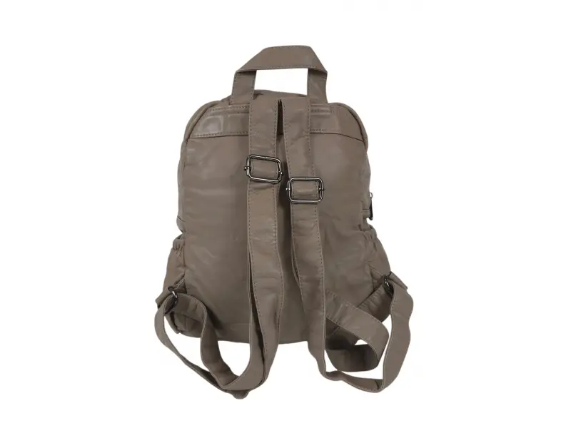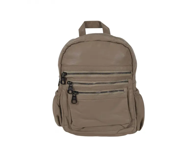 Ежедневна дамска раница - Дамска раница от варена кожа. - Едно голямо отделение с цип. - Вътрешен джоб с цип. - Отделение за телефон и документи. - Три предни джоба с цип. - Два странични джоба. - Дръжка за носене в ръка. - Регулиращи се презрамки.