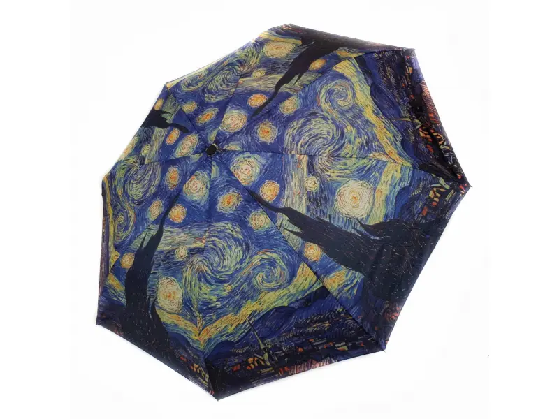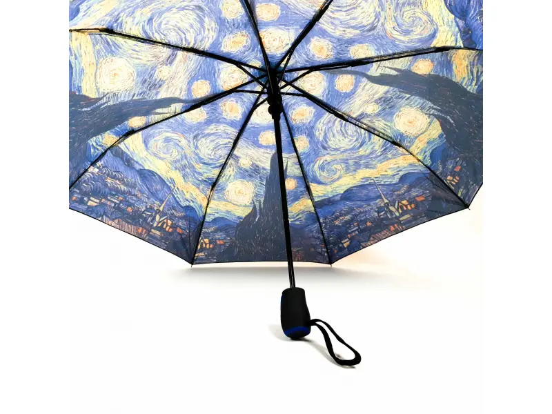 Компактен дамски чадър с изображението на картината на известния Ван Гог - "Звездна нощ". Качествен чадър с автоматично отваряне, бързосъхнеща материя, удобна дръжка и калъф за прибиране. Височината в сгънато състояние - 30 см.