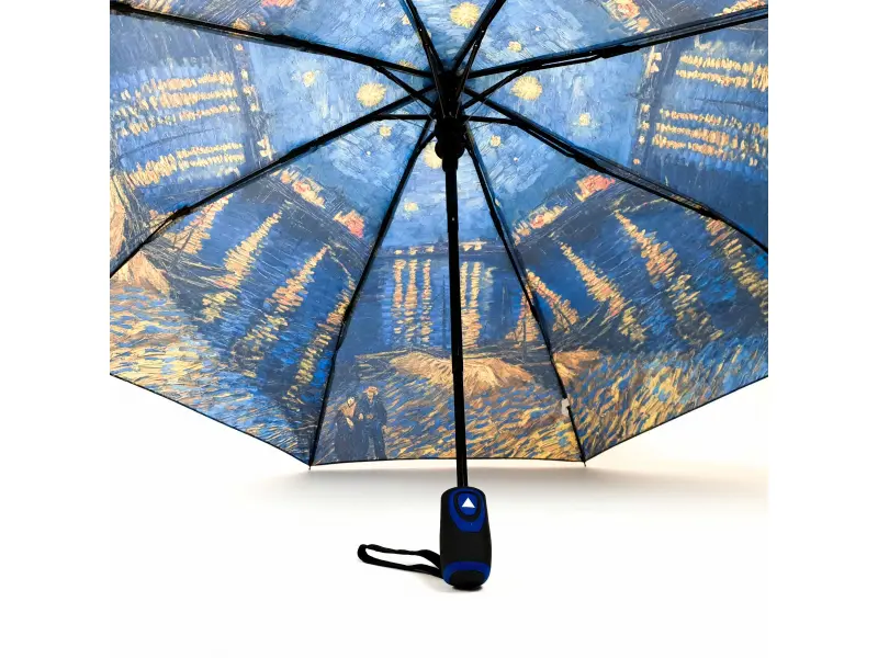 Компактен дамски чадър с изображението на картината на известния Ван Гог - "Звездна нощ над Рона". Качествен чадър с автоматично отваряне, бързосъхнеща материя, удобна дръжка и калъф за прибиране. Височината в сгънато състояние - 30 см.