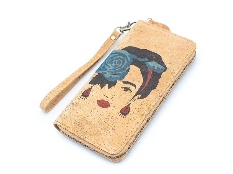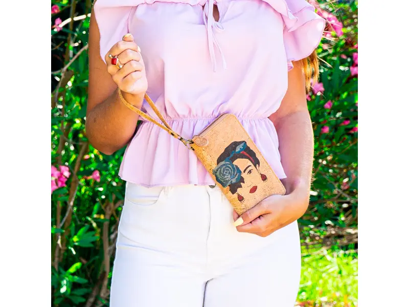Корково портмоне с Фрида Кохло Интересно дамско портмоне с мотиви.  Разполага с отделения за банкноти, монети и телефон. Портмонето е и с удобна дръжка за ръка.