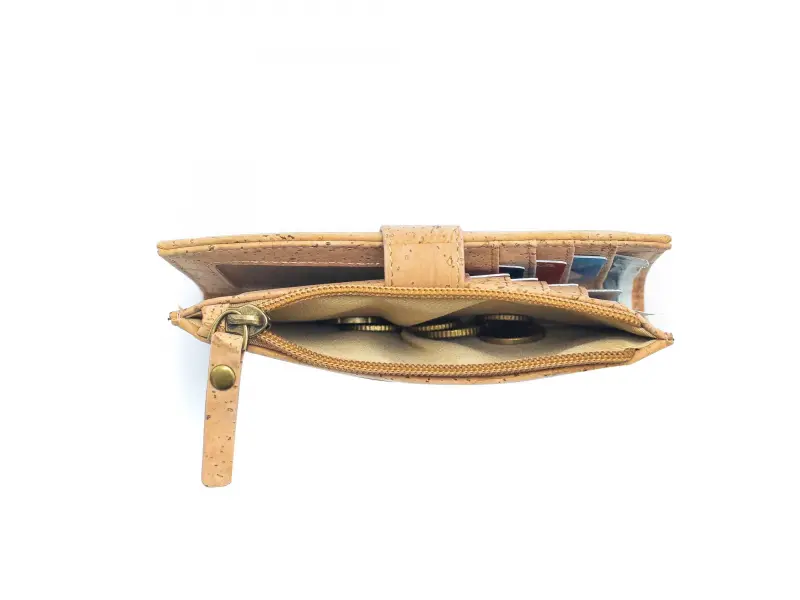 Интересно дамско портмоне от екологична, водоустойчива материя - корк. Качествено дамско портмоне със закопчалка, слотове за карти и документи, отделение за банкноти и външен монетник с цип.