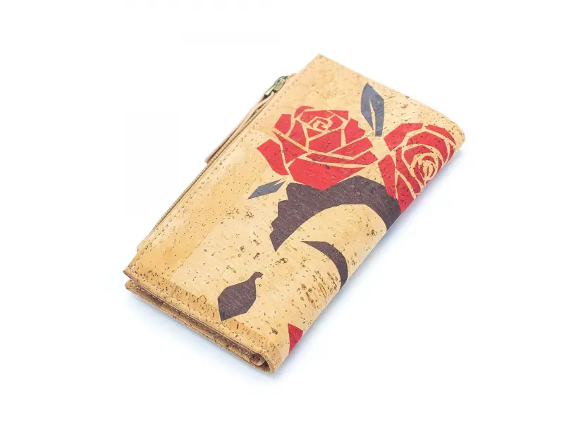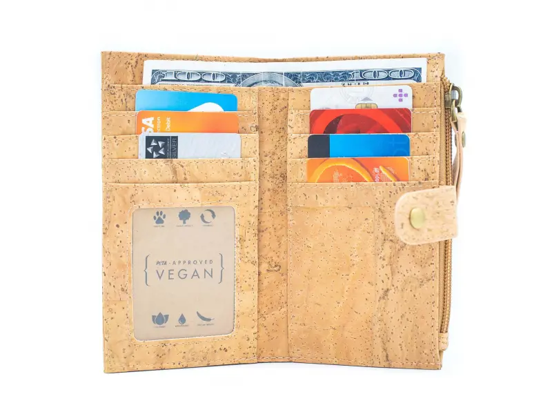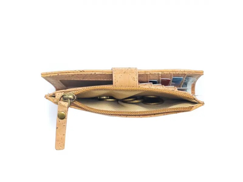 Интересно дамско портмоне от екологична, водоустойчива материя - корк. Качествено дамско портмоне със закопчалка, слотове за карти и документи, отделение за банкноти и външен монетник с цип.
