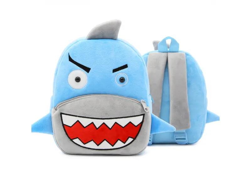 Детска раница - акула. Детска раница - акула от плюшена материя с едно остновно отделение и преден джоб с цип. Раница с меки и удобни регулиращи се презпрамки.