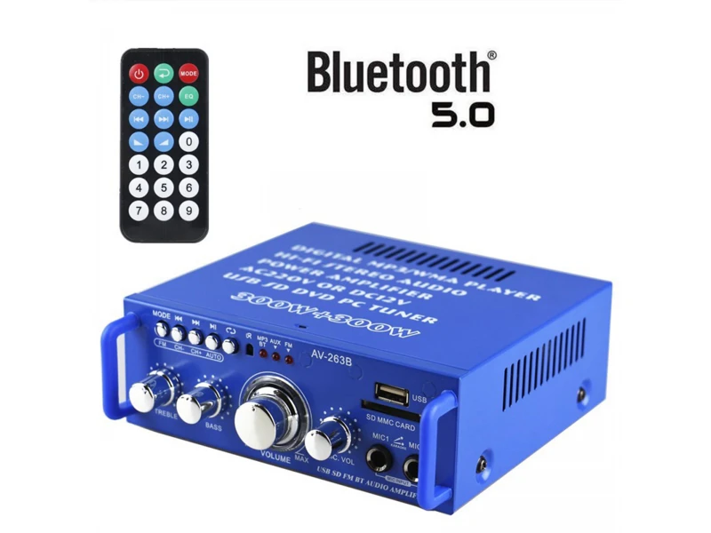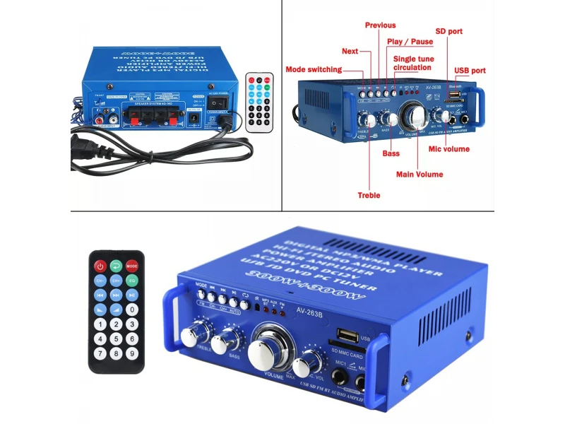 Характеристика:- LCD дисплей- МР3 плейър- Слот за USB флашка- Слот за Micro SD карта памет- Вход 6,35 жак за микрофон- Радио FM честоти: 87,5MHz - 108MHz- Мощност: 30W+30W- Честотен обхват: 20Hz-20KHz- Хармонични изкривявания: ~ 0,05% 4W 1 KHz- Съотношение сигнал/шум: 85dB- ДИСТАНЦИОННО управление.- Висок контрол: 12dB ± 10KHz- Контрол на басите: 12dB ± 10KHz- Ниво на сигнала: 220mv 47K- Захранване: 12 V ,,220V-240V- Размери: 16 х 15 х 5,5 см.