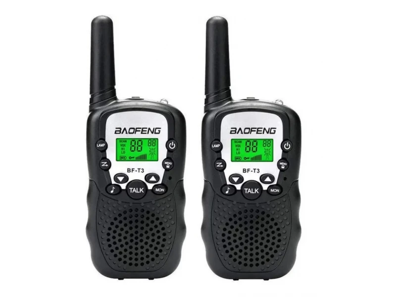 Baofeng BF-T3, изработени с високо качество, разполагат с 22 FRS и GMRS канала и 10 тонални повиквания и тонове на натискане на клавишите. Забавни и лесни за употреба, те ще се превърнат във верен приятел на вас или вашите деца. По време на игри, като част от самата игра или дори при друга необходимост, вие винаги можете да разчитате на тях. Получавате звукови сигнали с всяко натискане за отговор или потвърждение. Станцията се захранва с 4 X AAA батерии (не са включени). Вградено фенерче аудио тревога подсветка дисплей тонове на клавиатурата авто шумоподтискане.Поддръжка на функцията на Вокс, комуникация без нужда от аудио аксесоар.Характеристики:Честота – 462MHz-467Капацитет на канала – 22Разстояние на канала -12.5KHМощност: 2WВолтаж – 3.7V DC±15%Стабилност на честотата – ±2.5ppmРазмери – 140x55x25mmТегло – 220gДистанция – 3км (до 5км максимум в отворено пространство)Канали – всеки с 38 кодаВградена светкавица10 мелодииТон за потвърждение на разговораБеклит дисплейЕкранЗвук на бутонитеЗаключване на бутонитеЗвук при изтощена батерияКанал за съхранение: 8Комплектът включва:2бр Baofeng BF-T32бр Щипка за коланТранспортна опаковка