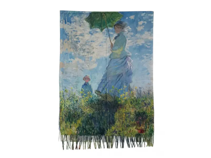 Комплект двулицев дамски шал и ръкавици с изображението на картините на известният Клод Моне - "Водни лилии" и Клод Моне - "Мадам Моне и нейният син". Мек и удобен шал от 100% вискоза. Ръкавиците са един размер имат еластичност от S до XL с показалеца може да се работи на телефон или смарт устройство.