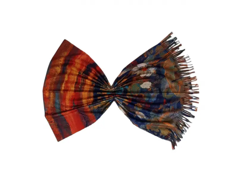На шалът са изобразени картините „Водни лилии ver2“ на Клод Моне и „Синята къща“ на Морис де Вламинк.